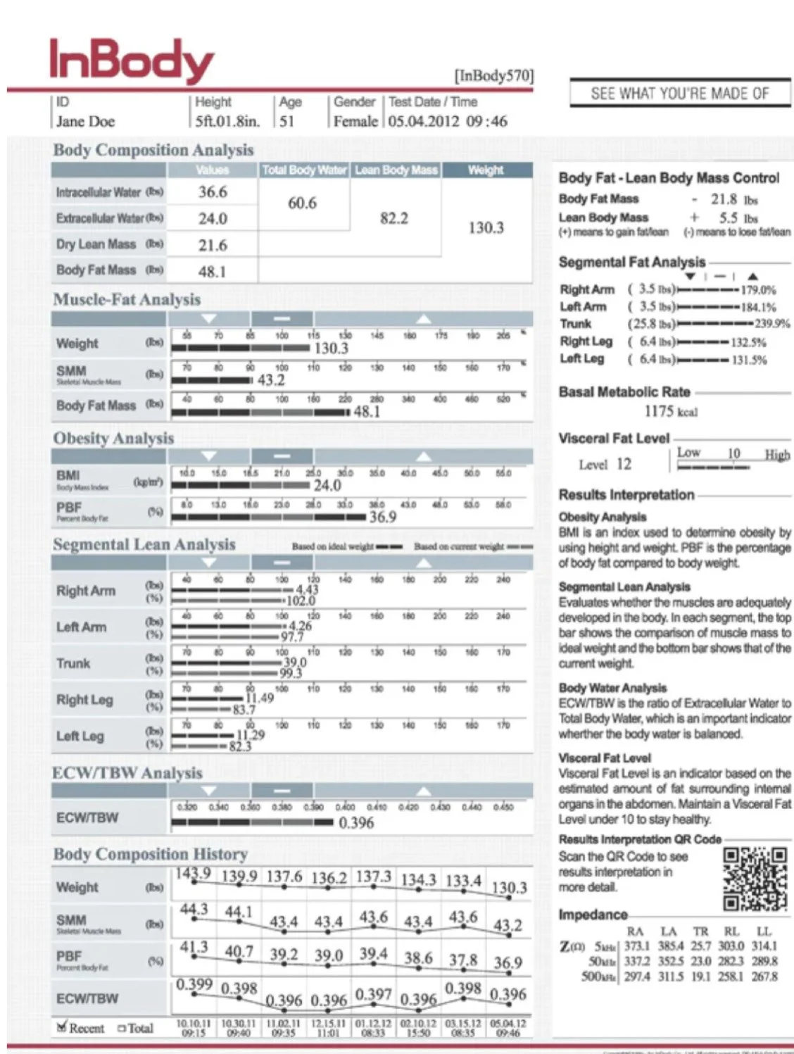 Every InBody Test includes a full-page Result Sheet printout that details muscle, fat, and water measurements and highlights specific areas to focus on.